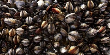 Marine mussels are usually found clumping together on wave-washed rocks, each attached to the rock by its byssus, which helps hold the mussels firm against the force of the waves.